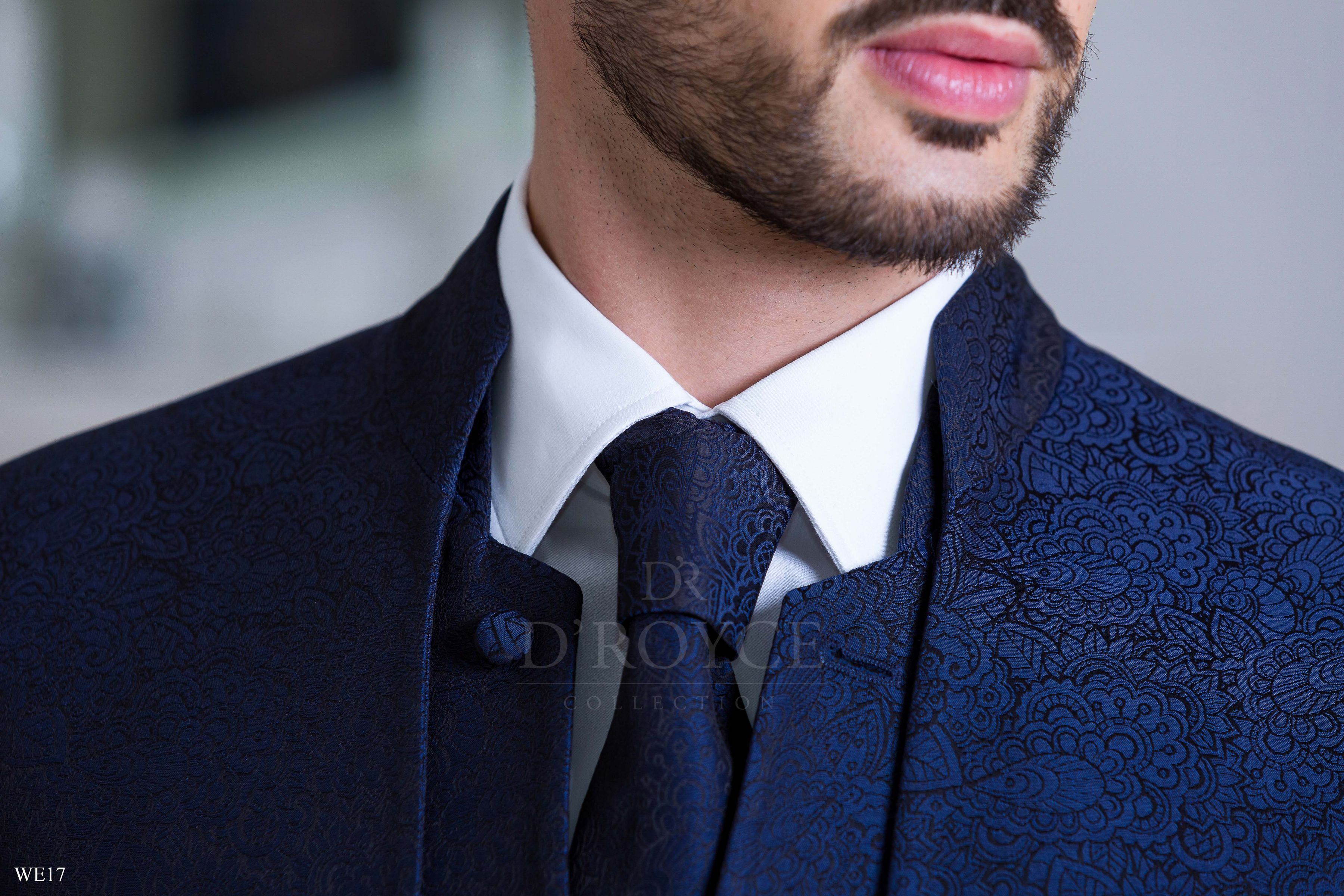 Kék szatén öltöny állógallérral