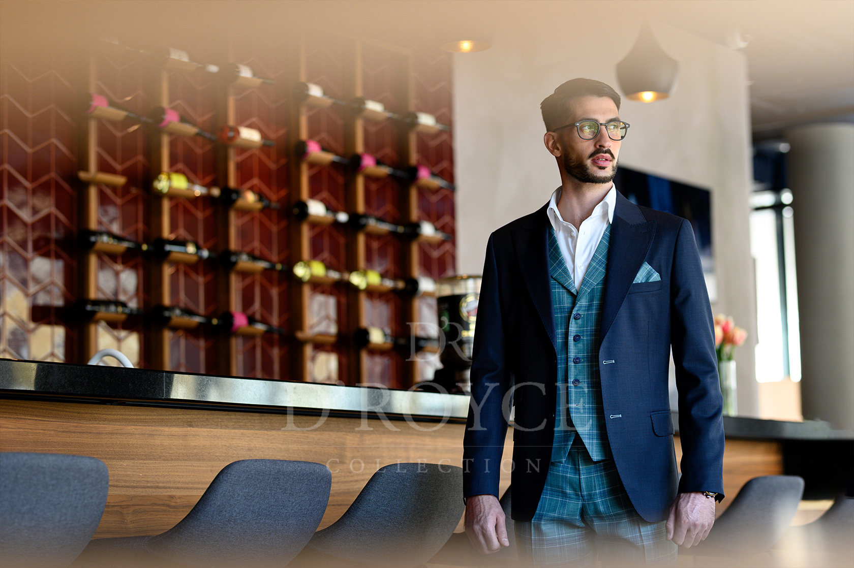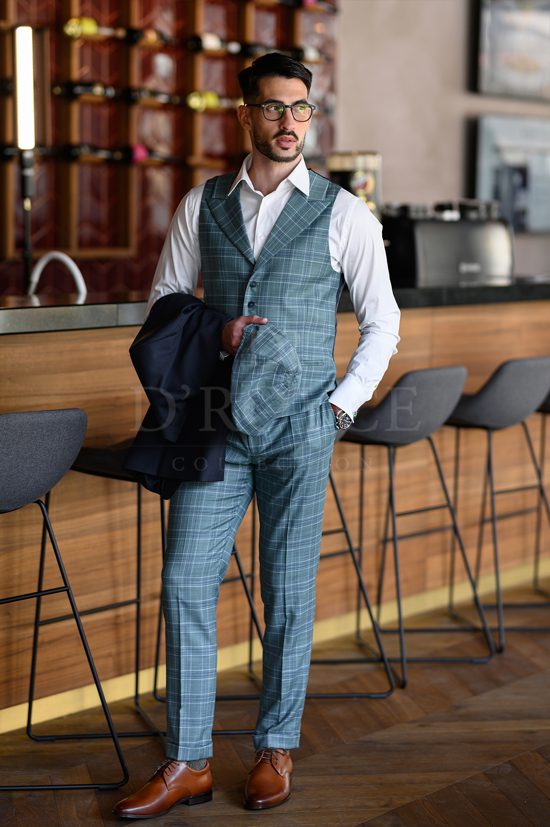 Sötét kék öltöny kockás mellénnyel